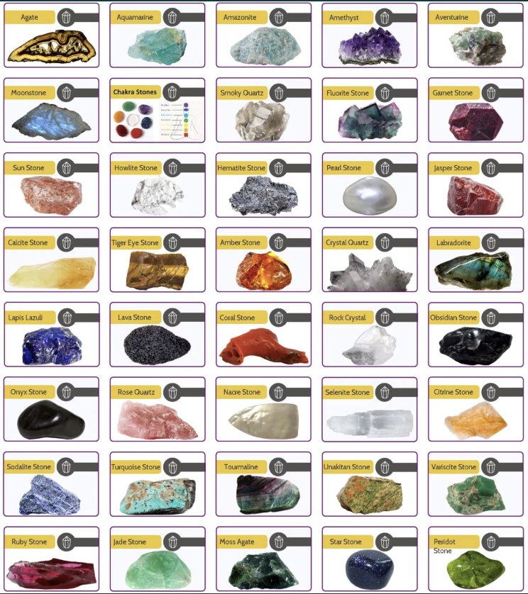 Akuamarin, Amazonit, Ametist, Aytaşı, Kristal kuvars, Aventurin, Necef, Dumanlı kuvars, Florit, Garnet, Jasper, Kalsit, Labradorit, Lapis lazuli, Hematit, Obsidyen, Rodokrozit, Selenit, Sitrin, Sodalit, Turkuaz, Turmalin, Yakut, Yeşim